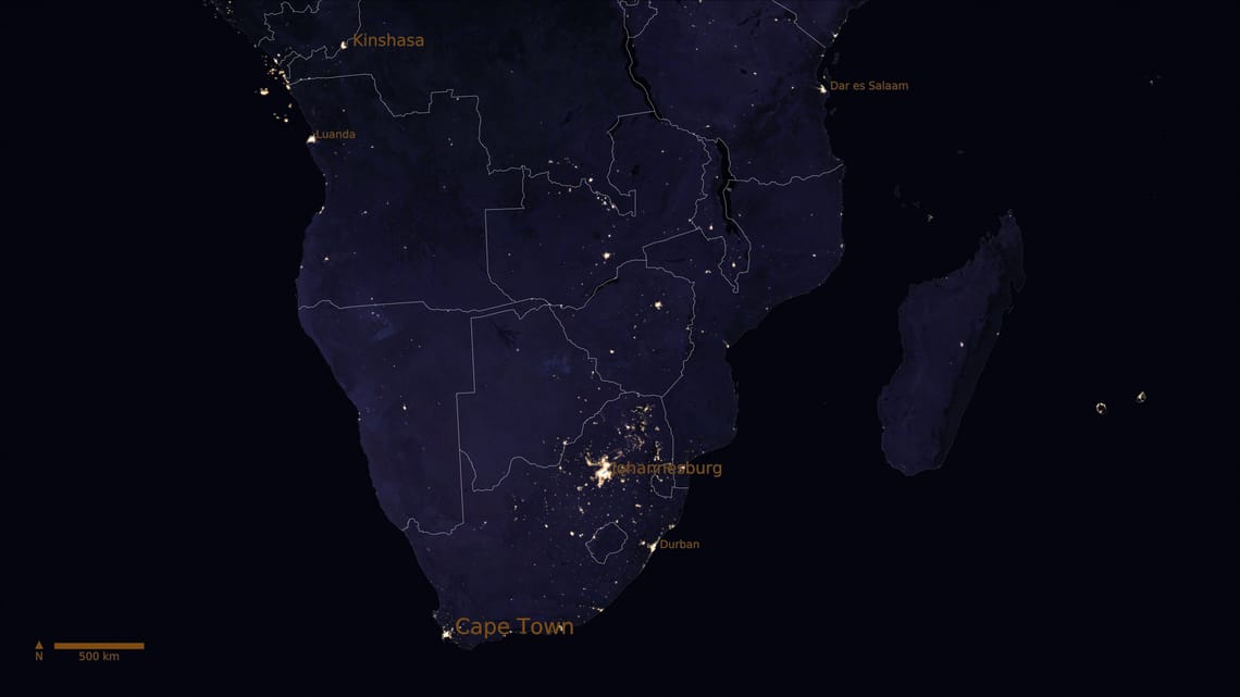 Das ist Südafrika bei Nacht, alles doch sehr sehr dunkel
